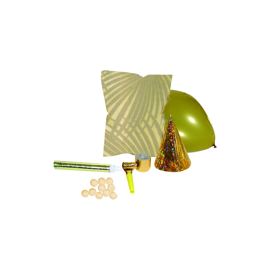 Super fiesta avec ce kit doré individuel composé d'un coussin, d'un ballon, d'un chapeau pointu, d'une sarbacane, d'un serpentin, d'un sans-gêne et de cotillons. Ceci est parfait pour le Nouvel An chinois, un carnaval, un anniversaire, la Noël et le Nouvel An.