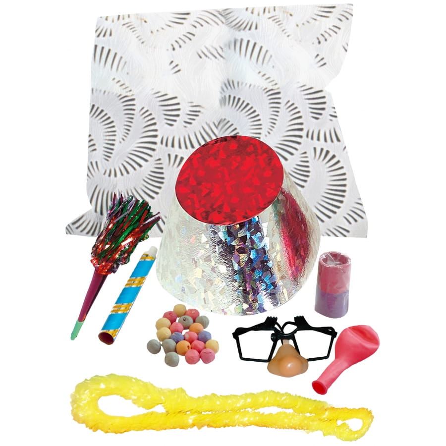 Il y a de quoi vous ravir dans ce sachet de cotillons luxe, Messieurs. Si vous aimez faire la fête, vous adorerez en avoir un comme celui-ci. Ce sachet en polypro de couleur argentée contient 1 chapeau grand modèle, 1 rouleau de 20 serpentins, 1 sachet sarbacane avec boules, 1 ballon, 1 nez naturel lunettes, 1 collier hawaïen et 1 trompette métallisée. Rien que ça ! Alors n'attendez plus pour vous le procurer.