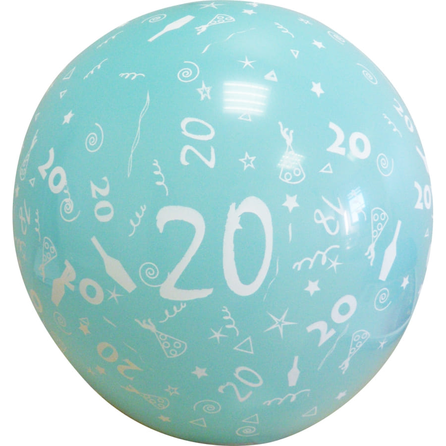 Ballons bleus pour un vingtième anniversaire, imprimés du chiffre 20 en blanc et vendus en sachet de 10. Ces ballons sont fabriqués en latex naturel et biodégradable. Ils peuvent être gonflés à l'air ou à l'hélium.