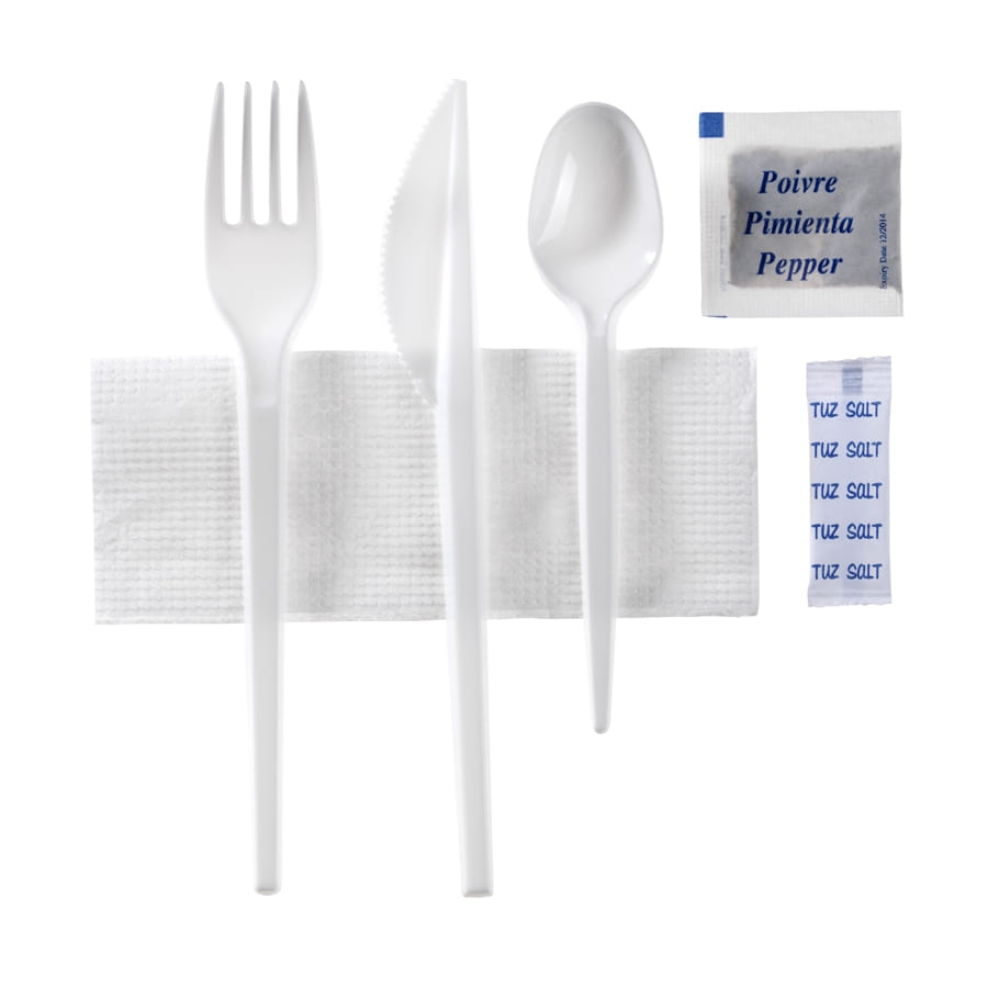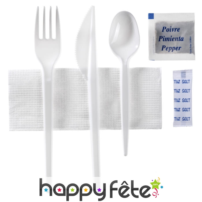 Comme son nom l'indique, vous y retrouverez un petit sachet de poivre, un petit sachet de sel, une serviette, un couteau, une fourchette et une cuillère, le tout en blanc.