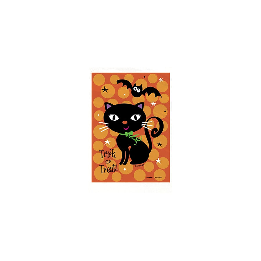 Il s'agit d'un lot de 50 sacs à friandises de couleur orange et imprimé, au recto comme au verso, d'un chat noir, d'une chauve-souris noire ainsi que d'une inscription « Trick or Treat ».