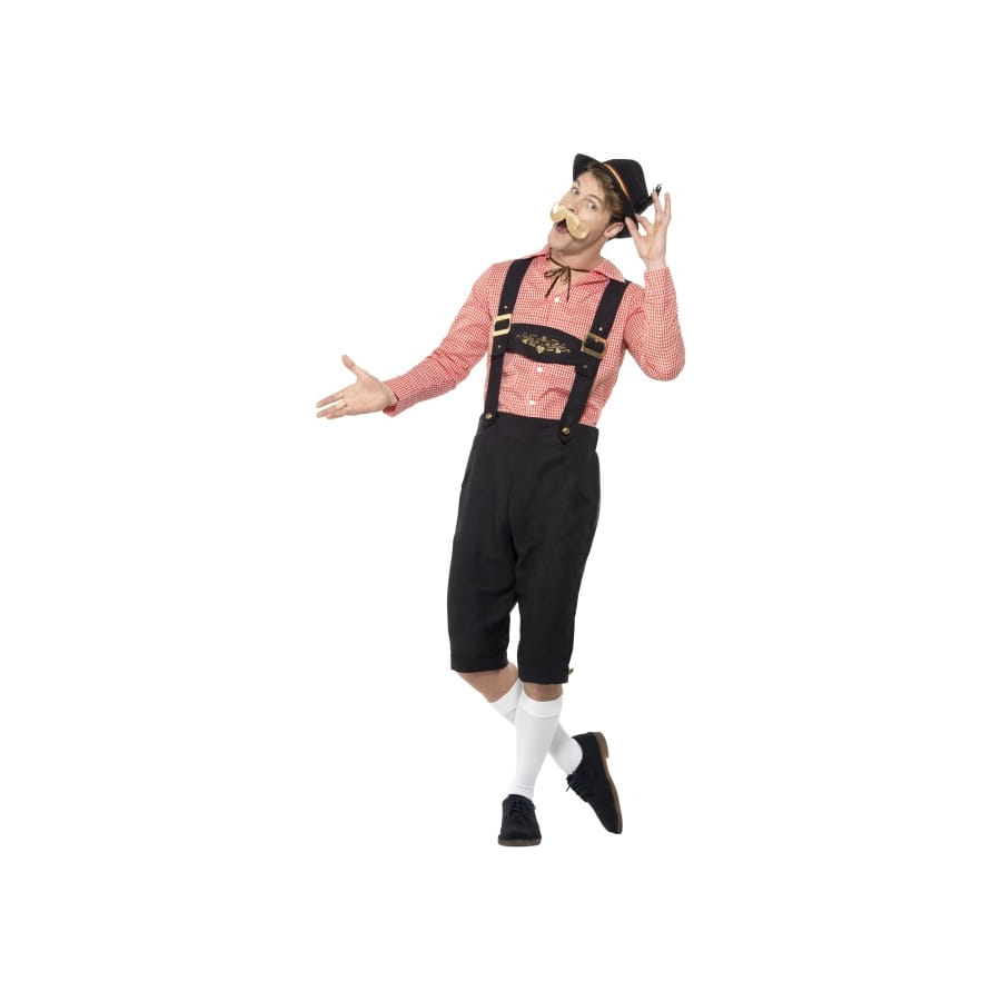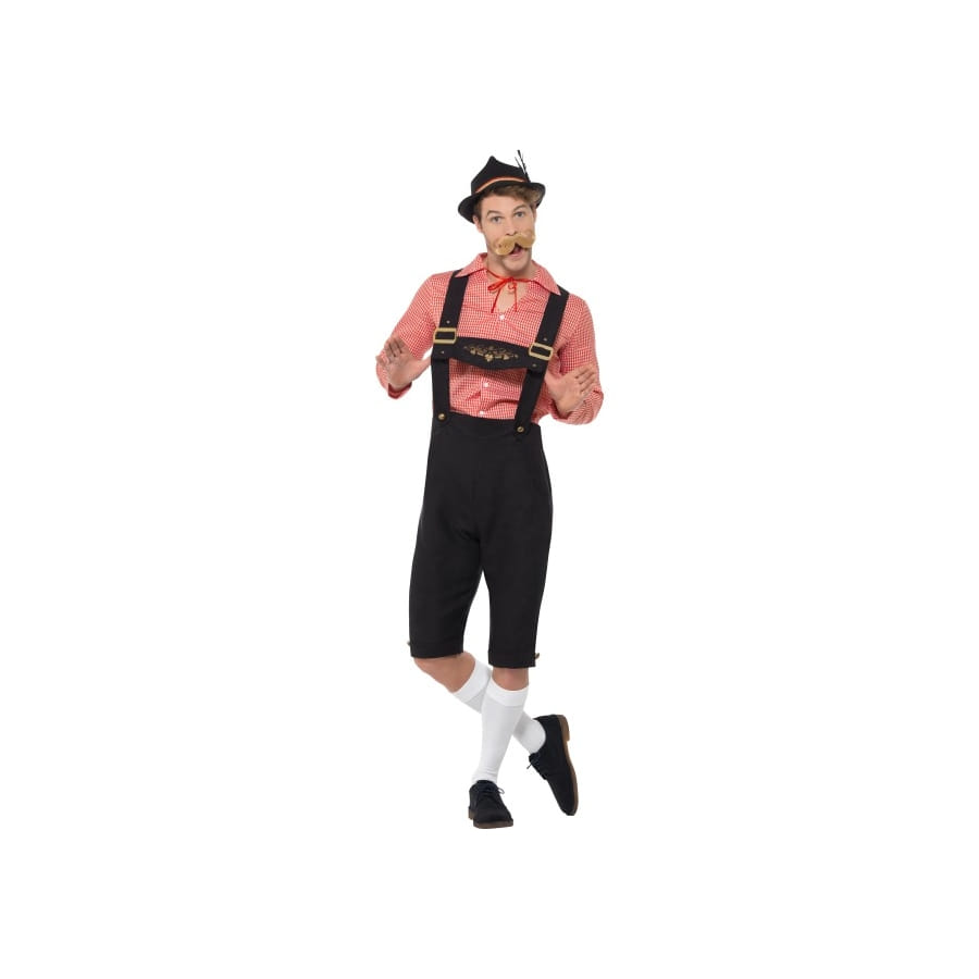 Voici la tenue idéale pour des festivités à thème historique ou folklorique : la salopette longue de Bavarois avec haut rouge. Celle-ci est spécialement dédiée à ces Messieurs. Le costume se compose d'une salopette noire dont la longueur va jusqu'aux genoux. Les bretelles sont ornées de boutons dorés sur la ceinture et de boucles dorées au niveau de la poitrine, avec un écusson à motifs dorés reliant les deux bretelles sur le milieu. Une chemise rouge à petits carreaux est proposée pour le haut, avec des manches longues et des boutons sur la devanture. Pour parfaire le tout, nous vous suggérons un chapeau de type tyrolien, une petite moustache arrondie, et de longs bas avec la salopette. Tous ces accessoires ne sont pas fournis avec l'ensemble, mais vous pourrez les retrouver facilement sur notre site.