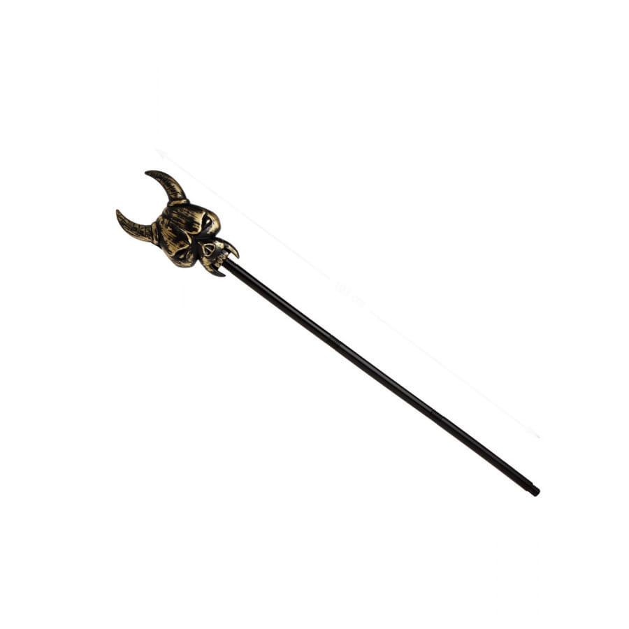 Le long manche est noir tandis que la tête effrayante qui la surmonte est dorée et possède deux cornes crochues et des crocs acérés.