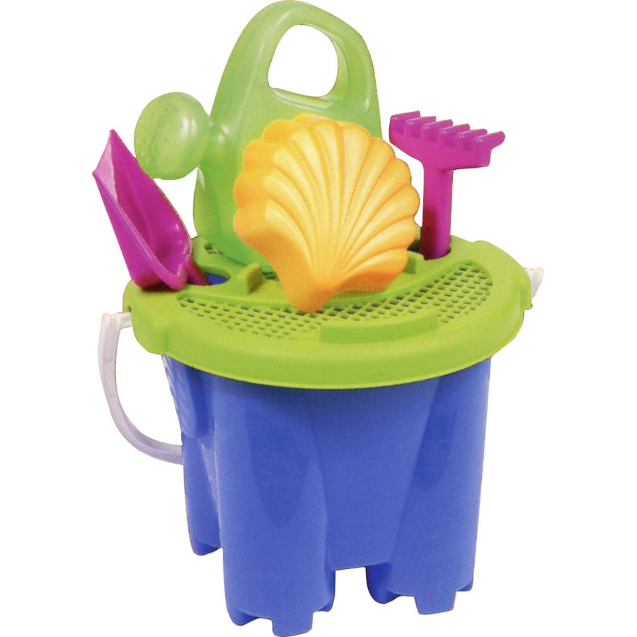 Accessoires de plage composés d'un seau en forme de château fort comportant un arrosoir, un rateau, un moule en forme de coquillage et d'une pelle, de couleur bleue, jaune, verte et violette. L'arrosoir mesure 18 centimètres. Votre enfant sera ravi de recevoir cet ensemble de jouets!