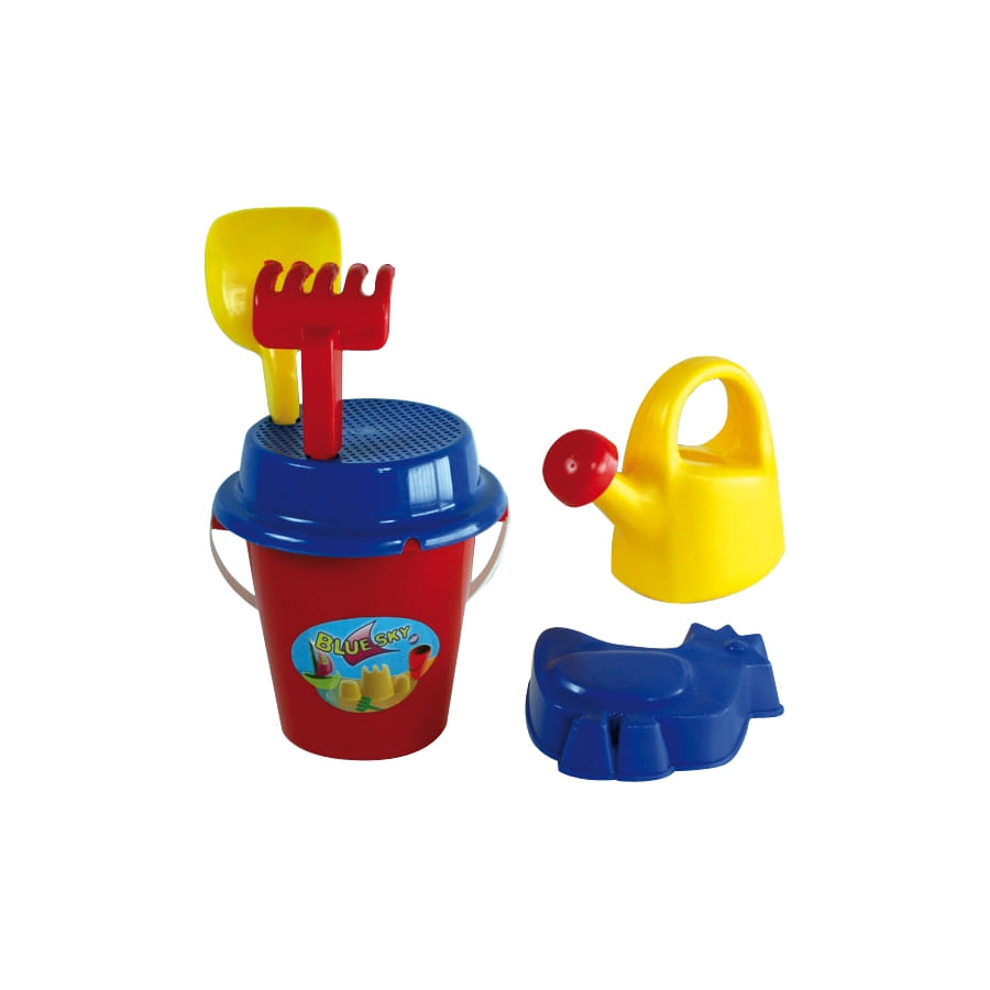 Set de plage, pour enfants, composé d'un seau rouge et bleu, d'un arrosoir jaune et rouge, d'un rateau rouge, d'une pelle jaune et d'un moule en forme de poule bleu. Emportez ce set à la plage pour que vos enfants puissent s'amuser.