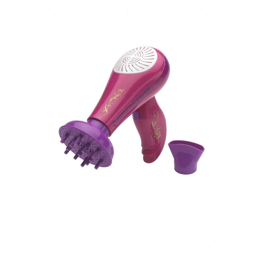 Votre petite fille sera contente de recevoir ce faux sèche cheveux, elle va jouer avec toute la journée. Ce faux sèche cheveux est de couleur rouge avec des motifs doré dessus, les accessoires sont violet.
