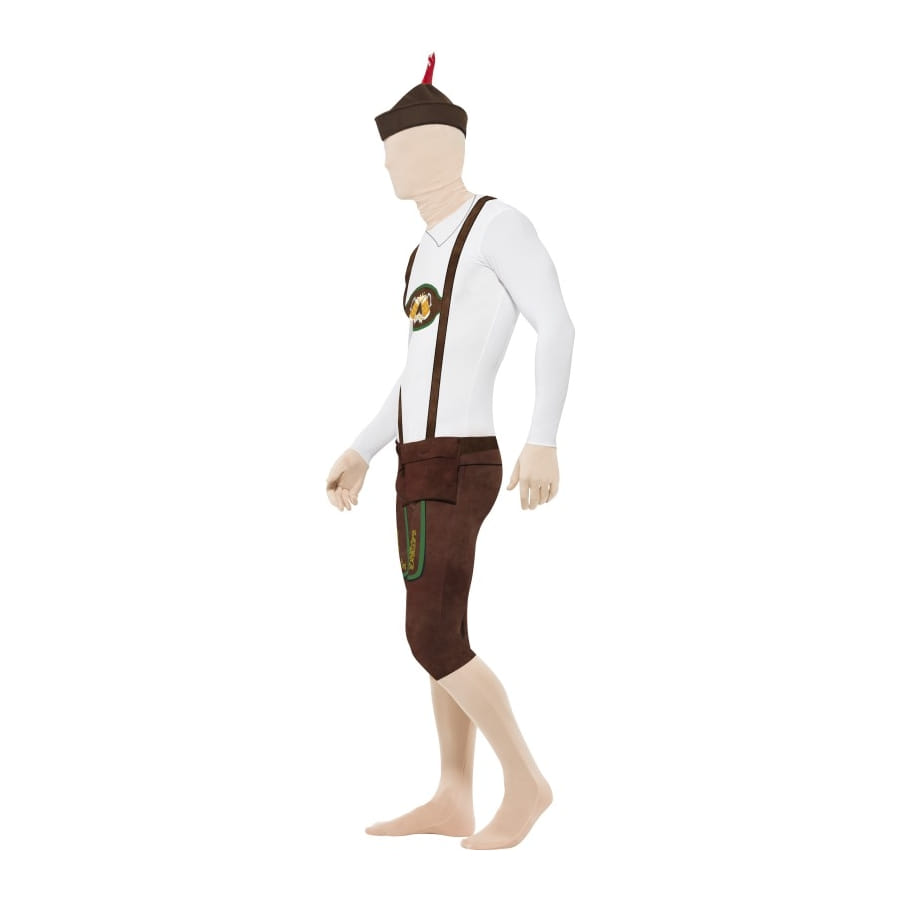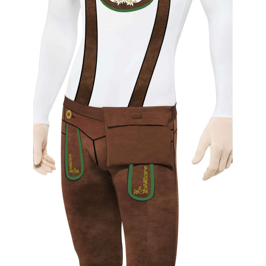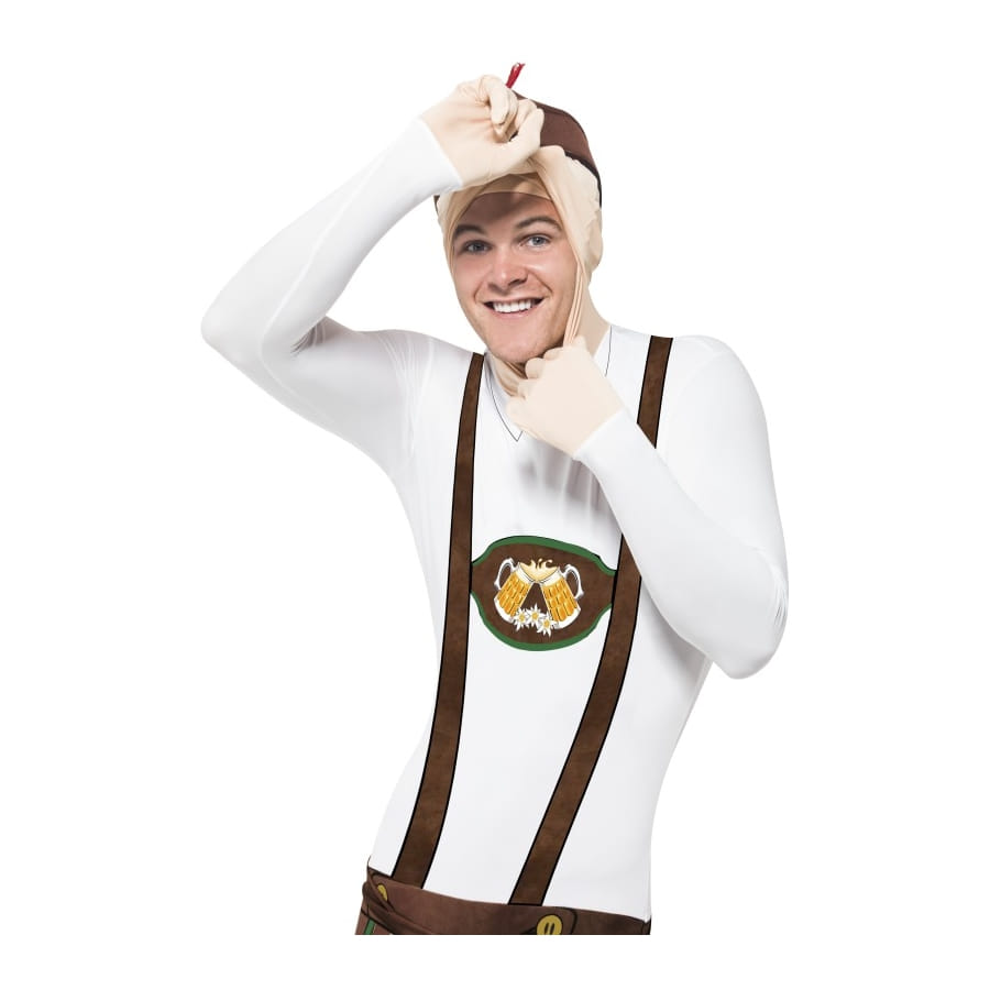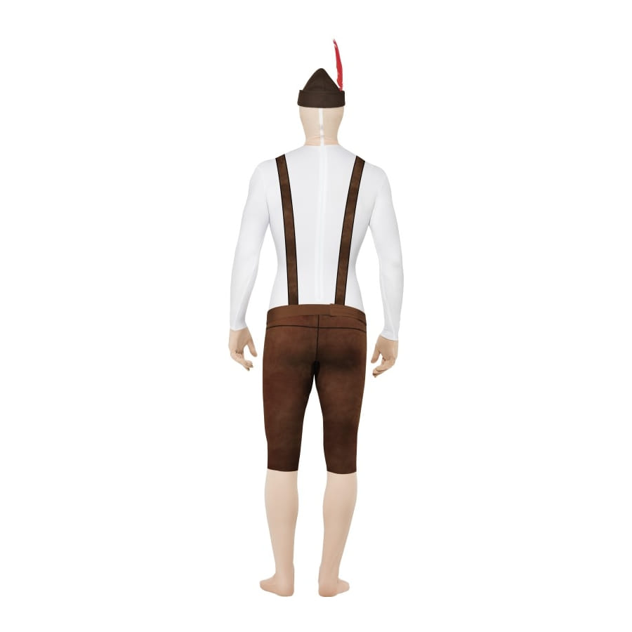 Grâce à ce costume, vous serez littéralement dans la peau d'un bavarois ! Découvrez la culture originaire de la Bavière à travers cette fabuleuse seconde peau sous licence seconde peau! Que ce soit pour la fête de la bière, pour un évènement spécial, ou tout juste pour s'amuser, ce costume folklorique bavarois est idéal. Il saura vous habiller de la tête aux pieds. Vous disposerez d'une seconde peau de couleur blanche et marron. Elle donne l'impression que vous portez un haut blanc à manches longues ainsi qu'un short marron avec des bretelles. Le reste affiche la couleur chair, même au niveau du visage. Une fermeture se situe en dessous du menton. L'ensemble est aussi dotée d'une petite besace marron et d'un chapeau assorti. Les tailles disponibles sont : la taille M correspondant à une poitrine de 96-101 cm et un entrejambe de 83 cm, la taille L correspondant à une poitrine de 106-110 cm et un entrejambe de 83,8 cm, et la taille XL correspondant à une poitrine de 116-121 cm. Le nettoyage de cet article doit impérativement se faire à sec.