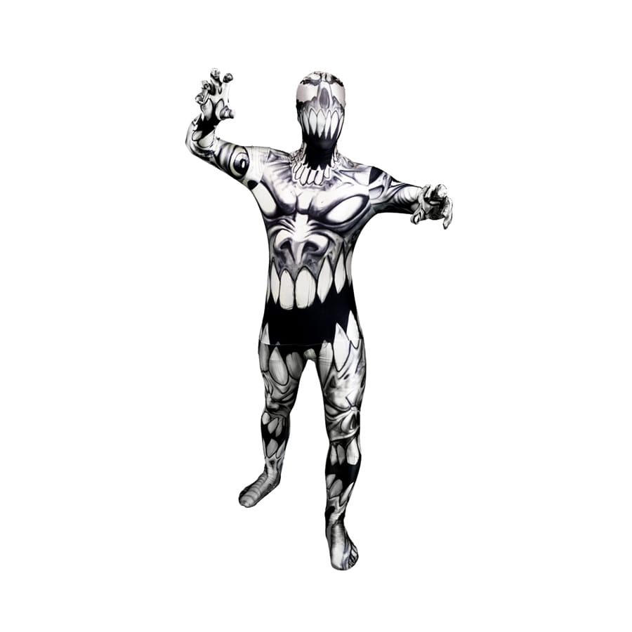 Recherchez-vous quelque chose d'effrayant et de différent pour égayer votre soirée Halloween ? Vous êtes tombé au meilleur endroit. Voici un déguisement seconde peau composé d'une combinaison complète qui couvre la tête, le corps, les mains et les pieds (tout attaché), avec une fermeture éclair à l'arrière. La combinaison est imprimée d'un visage monstrueux, de couleur noire et blanche. Cette tenue est spécialement conçue pour les hommes, de tailles L et M, vous ne la retrouverez qu'ici. Alors, n'attendez plus pour saisir cette effroyable opportunité !