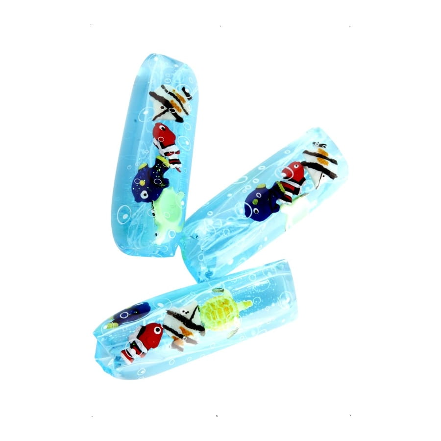 Serpents d'eau de couleur bleue, avec poissons multicolores à l'intérieur, pour enfants. Ces jouets sont vendus dans une boîte de 24. Distribuez-les à l'occasion d'un anniversaire ou d'une kermesse.
