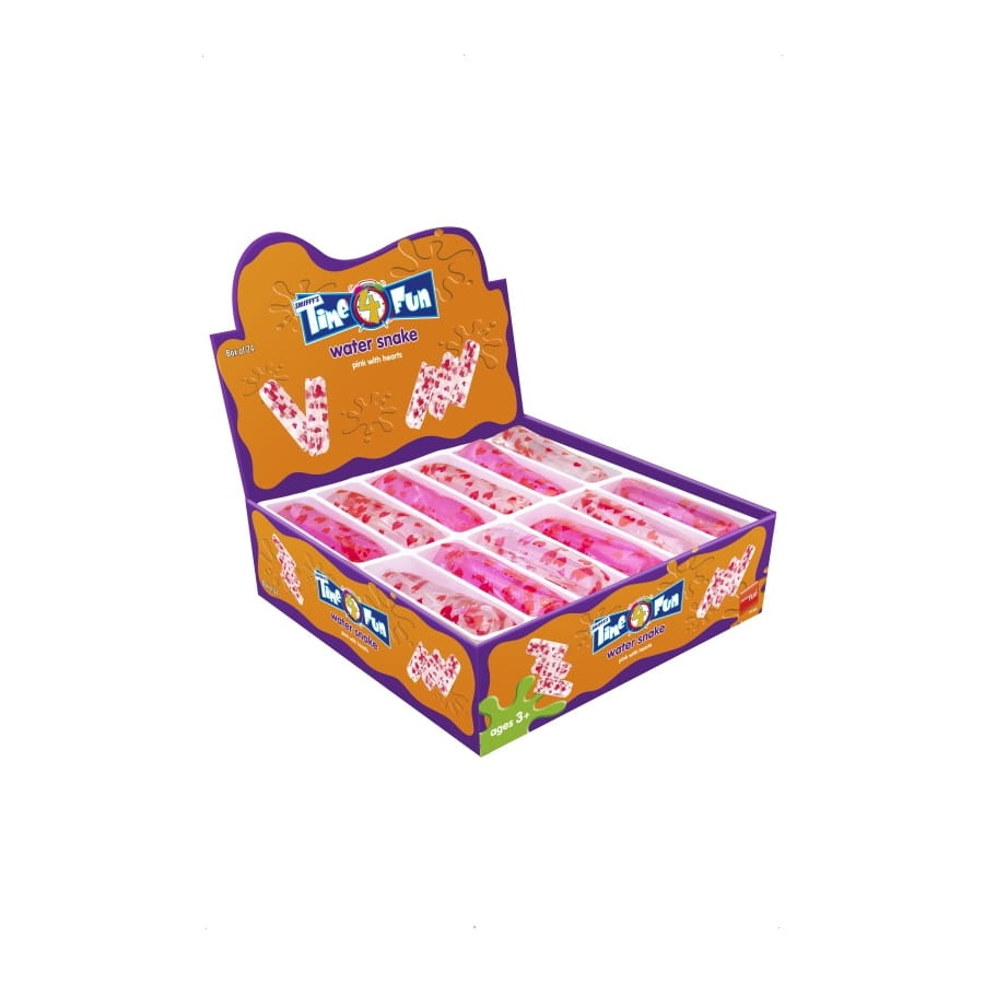 Serpents d'eau transparents, pour garçon ou fille, imprimés de petits coeurs de couleur rose et vendus en boîte de 24. Distribuez-les lors d'un anniversaire ou d'une kermesse pour le plus grand bonheur des enfants.