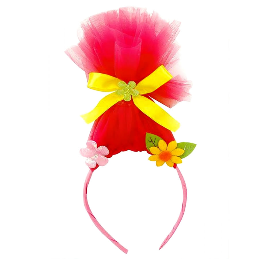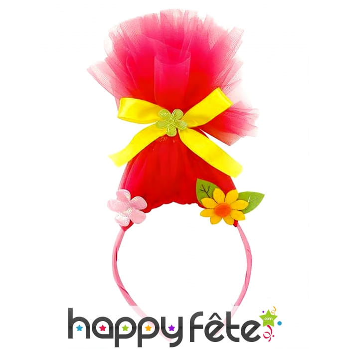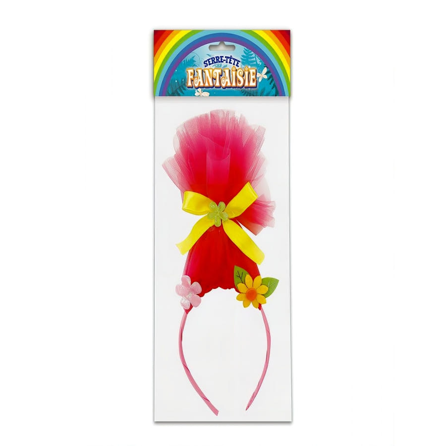 D'abord, parlons de la base : un serre-tête confortable, idéal pour éviter toute pression désagréable. Mais ce n'est pas tout ! Les créateurs ont vraiment mis le paquet. Il est orné de fleurs chatoyantes qui apportent une explosion de couleurs. Et puis, il y a cette magnifique imitation de chevelure troll, dressée fièrement en l'air. Ces cheveux rouges, qui semblent défier la gravité, sont attachés avec un noeud jaune ravissant, garni d'une petite fleur verte, histoire d'ajouter encore une touche de peps !