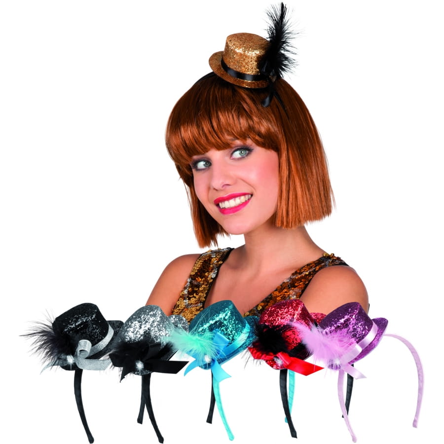 Serre-tête avec mini-chapeau de cabaret orné de plumes assorties. Il est impossible de choisir la couleur de cet accessoire lors de la commande. Vous recevrez le serre-tête dans une des couleurs disponibles: argent, bleu, noir, or, rouge ou violet. Cet accessoire est idéal pour un carnaval.