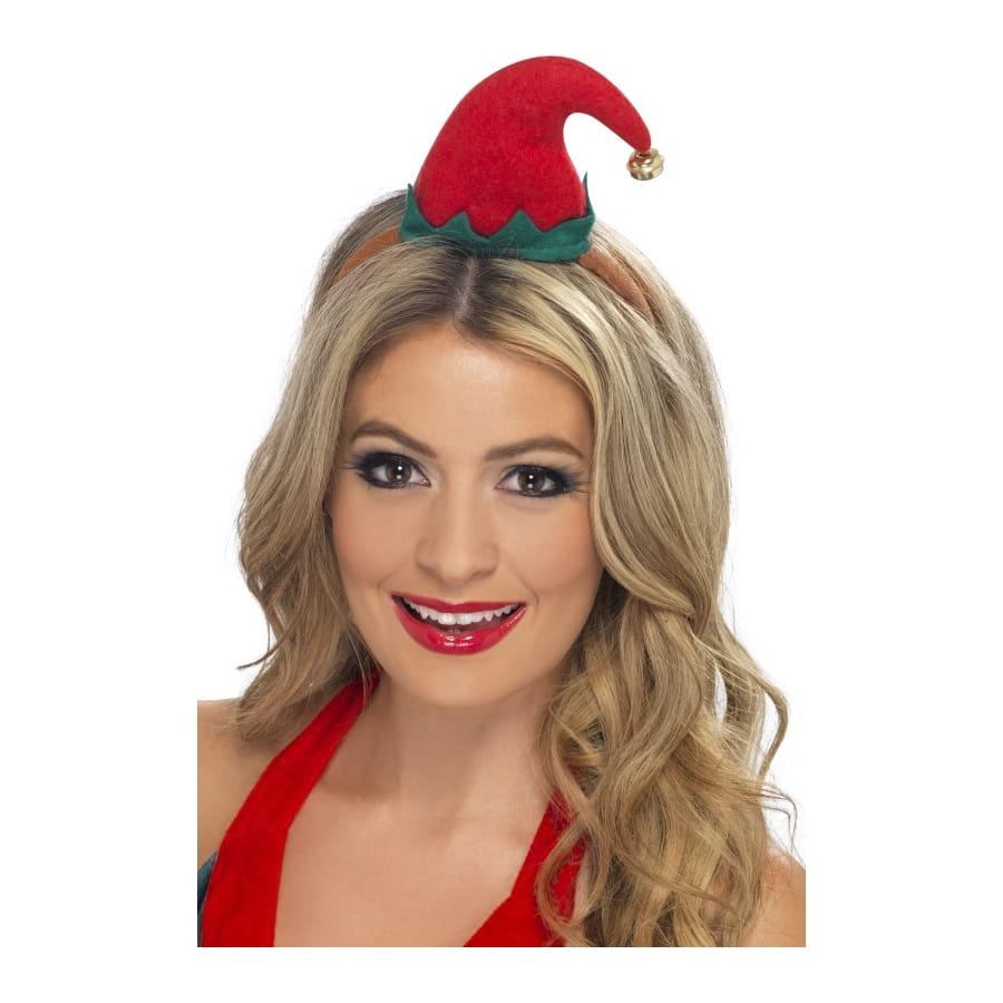 Serre-tête pour femme monté d'un mini-chapeau d'elfe. Ce dernier est de couleur rouge et verte avec un petit grelot doré accroché au bout. C'est un accessoire qui ira très bien à une tenue de Noël!
