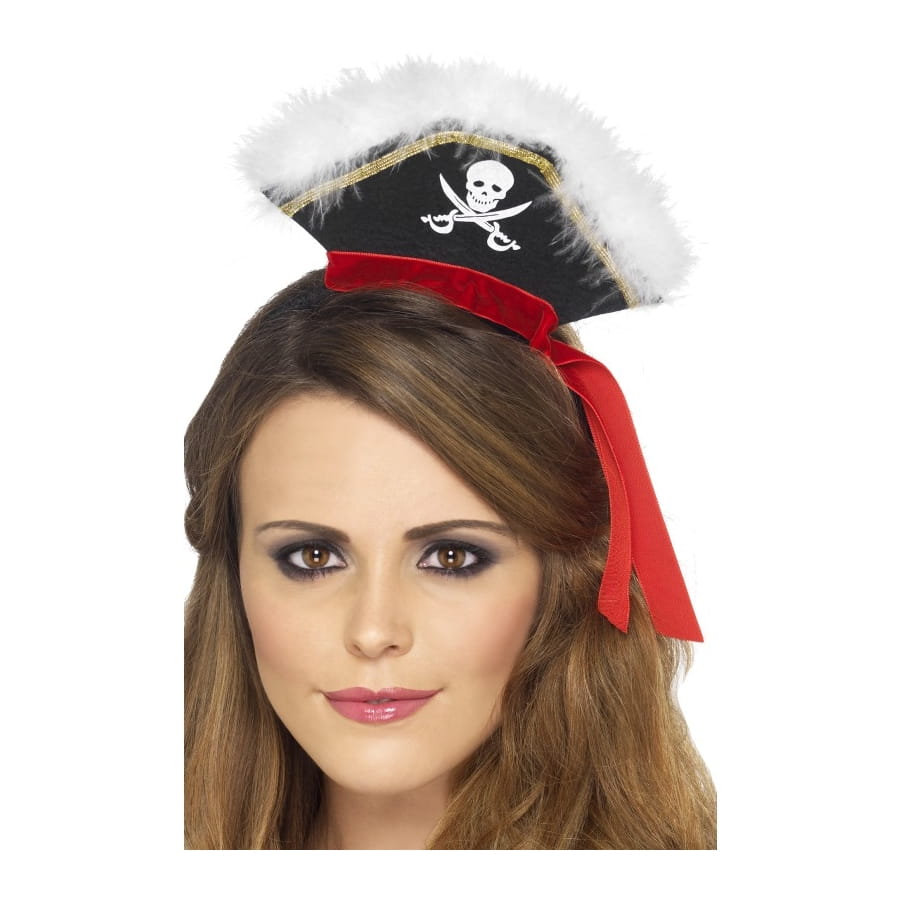 Serre-tête, pour femme, monté d'un mini-chapeau de pirate. Ce dernier est orné d'un ruban rouge, d'un rebord en marabout, d'une broderie dorée et d'un symbole de pirate blanc. Le tout vous donnera un air de pirate assez glamour.