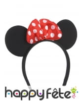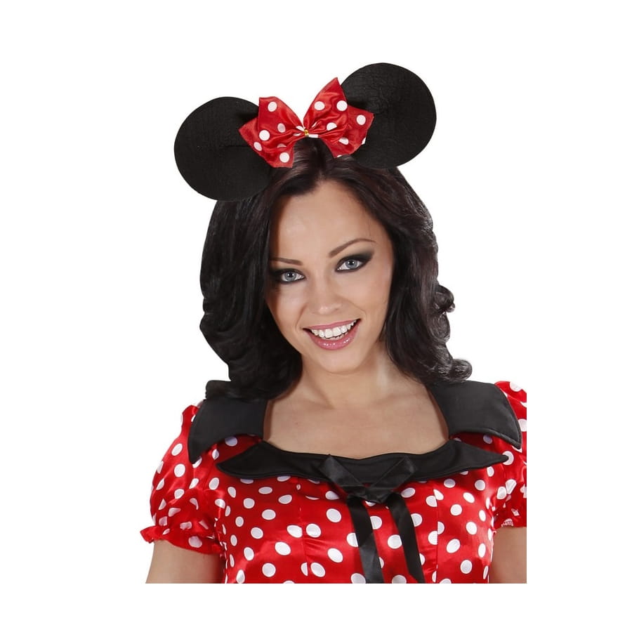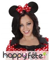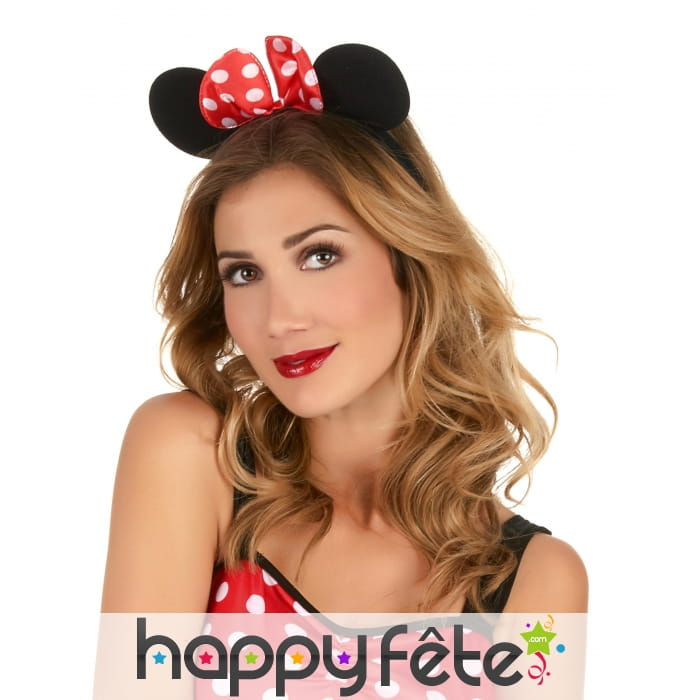 Deux grosses oreilles rondes surmontent le serre-tête et sont placées de part et d'autre d'un noeud rouge à pois blancs.