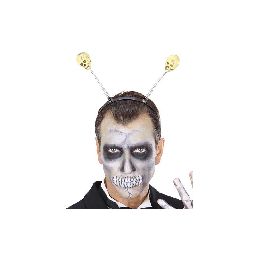 Serre-tête à ressorts montés de deux têtes de morts dorées, pour homme ou femme. Agrémentez votre tenue d'Halloween avec cet accessoire original et singulier.