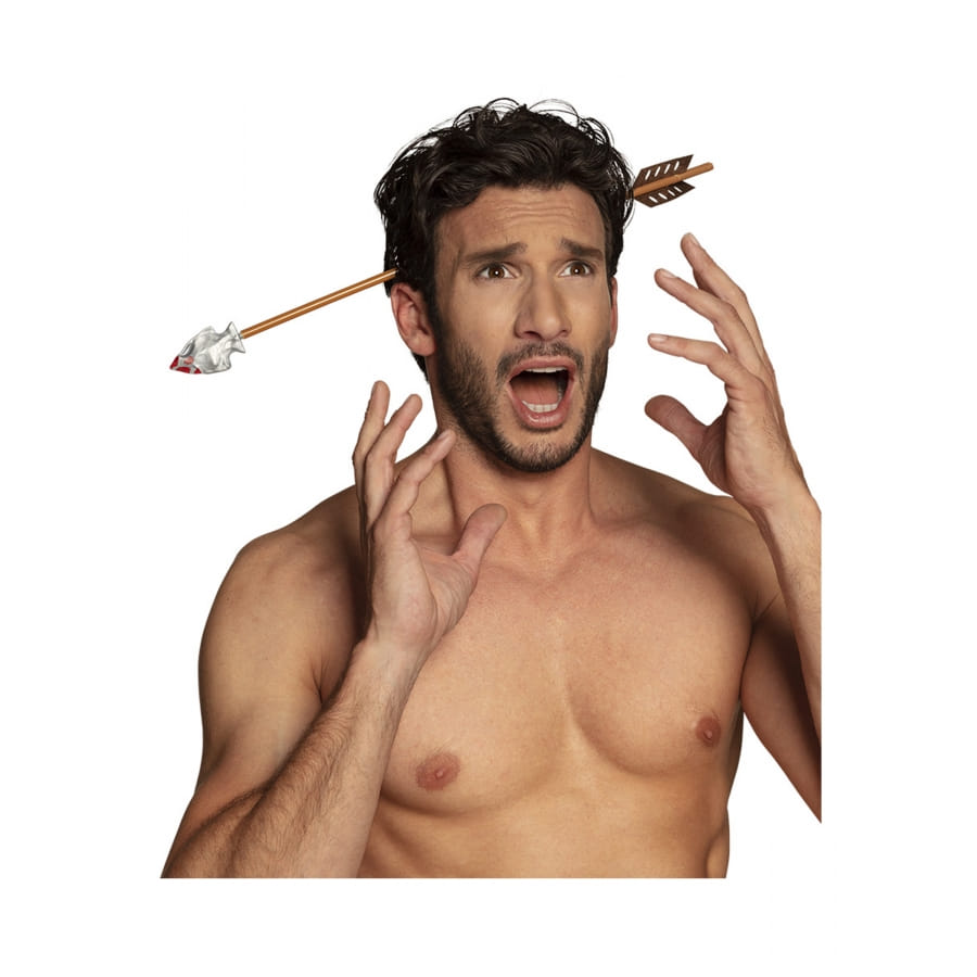 Le but de cette coiffe est de faire croire qu'une flèche immaculée de faux sang traverse votre tête.