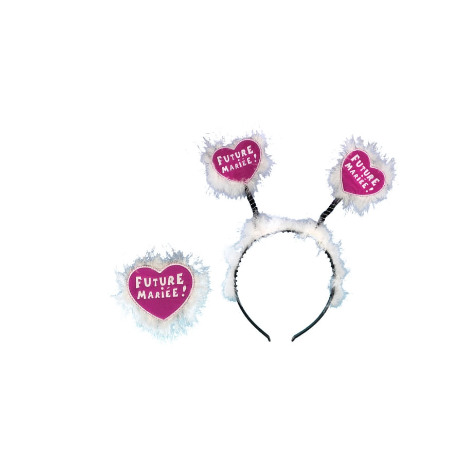 L'accessoire est doté de deux antennes sur lesquelles ont été placées des coeur roses à fourrure blanche avec inscription "future mariée".