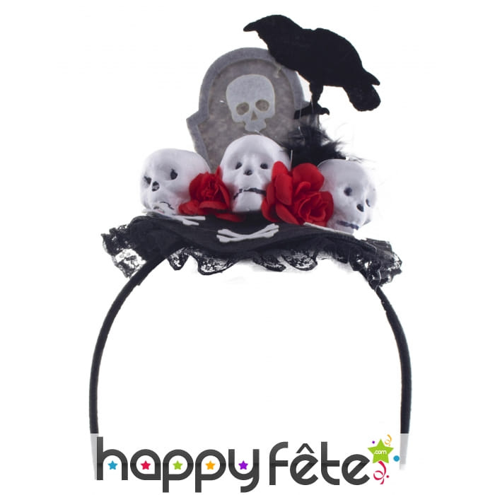 Ce serre-tête est de couleur noire et est décoré de 3 crânes blancs séparés par 2 roses rouges, le tout surmonté d'une pierre tombale et d'un corbeau.