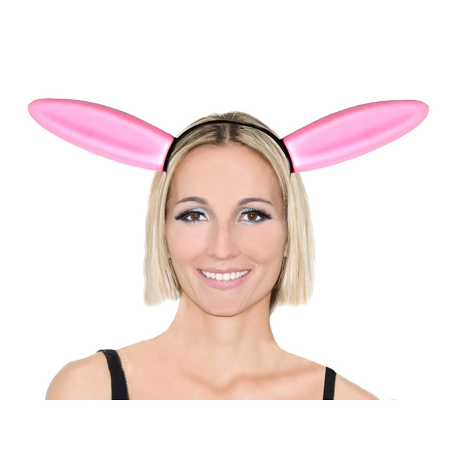 Serre-tête noir surmonté de deux oreilles de lapin rose. Cet accessoire est idéal pour un carnaval sur le thème des animaux.