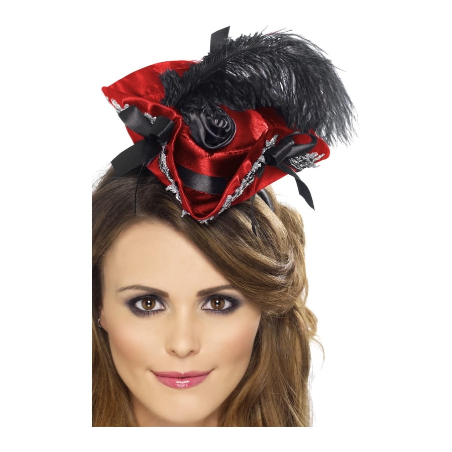 Serre-tête monté d'un mini-chapeau de couleur rouge, grise et noire, pour femme ou adolescente. Le mini-chapeau est orné de dentelle grise, de noeuds, plumes et fleurs noires. Il sera idéal pour un enterrement de vie de garçon ou de jeune fille ou pour une soirée basée sur le thème de pirate et de corsaire.