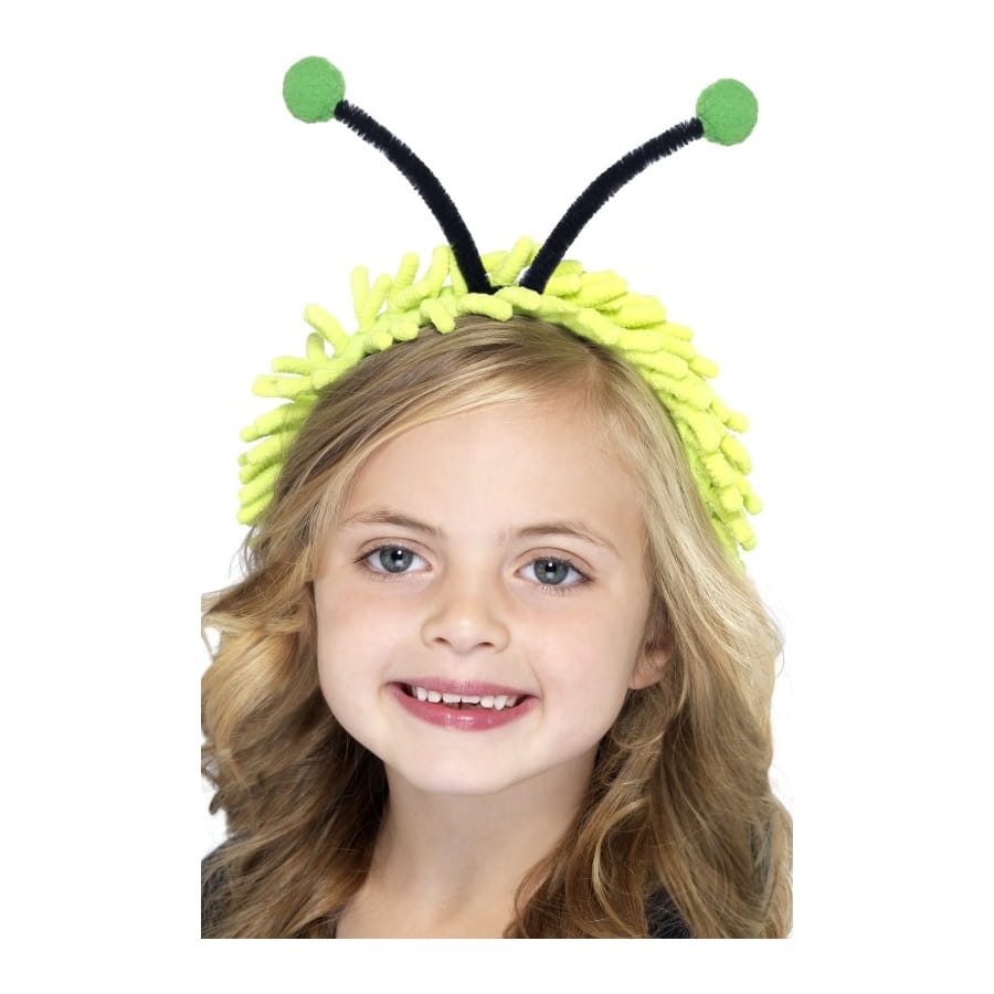 Serre-tête de couleur noire, monté d'une paire d'oreilles de coccinelle de couleur verte, pour garçon ou fille. Cet accessoire est parfait pour un goûter d'anniversaire pour enfants.