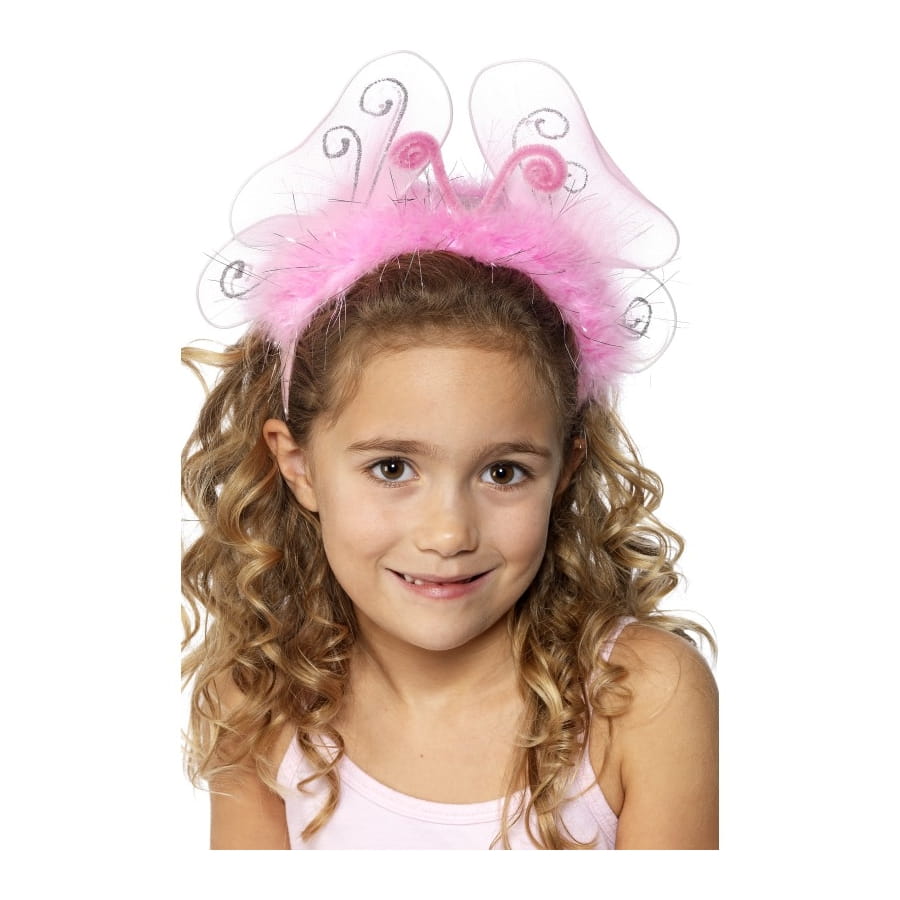 Serre-tête en forme de papillon de couleur rose, pour fille. Ce superbe accessoire est orné d'ailes transparentes avec filaments argentés, de marabout rose et de strass argenté. C'est un cadeau idéal à offrir à votre enfant.