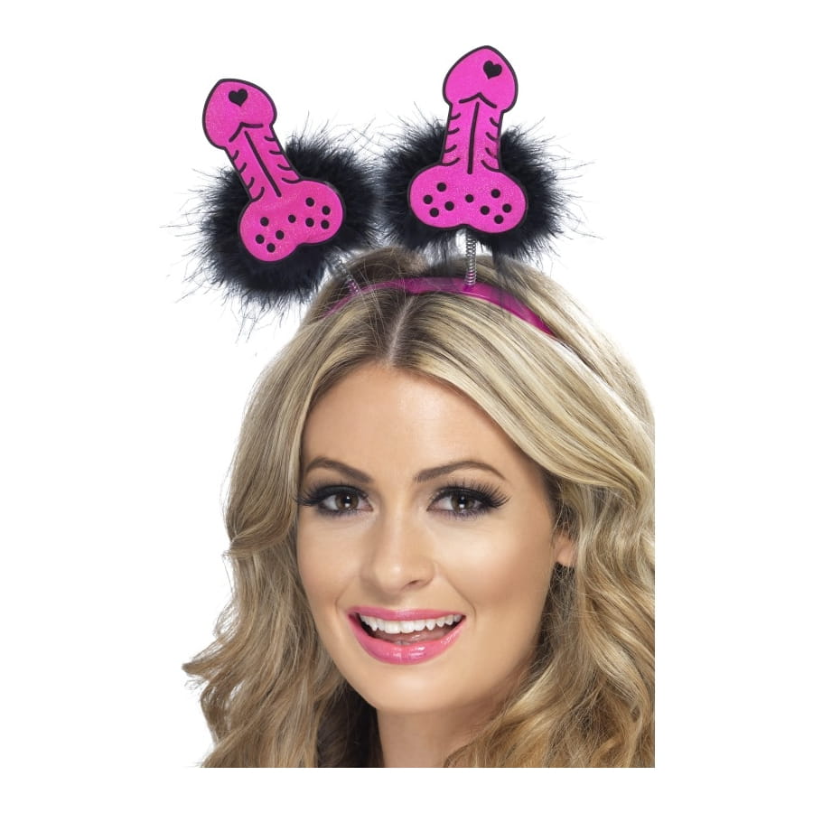 Serre-tête monté de deux pénis de couleur rose ornés de marabout noir, pour femme. Ce type d'accessoire est idéal pour un enterrement de vie de jeune fille.