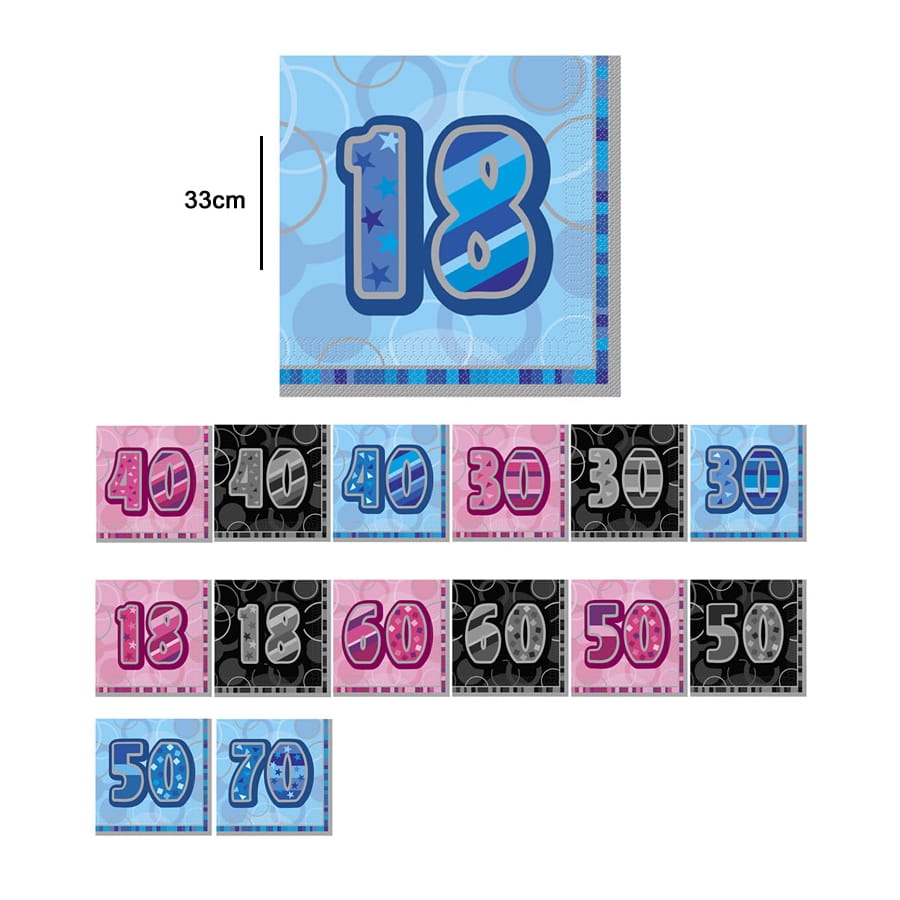 Un anniversaire de plus à fêter cette année ! Optez pour un élément original et très utile cette fois-ci avec ce paquet de 16 serviettes âge bleues, noires ou roses. Chacune d'elles mesure environ 16 x 16 cm. Un nombre est inscrit au centre dans de gros caractères. Différents modèles sont disponibles : en bleu, noir ou rose pour les 18 ans ; en bleu, noir ou rose pour les 30 ans ; en bleu, noir ou rose pour les 40 ans ; en bleu, noir ou rose pour les 50 ans, en noir ou rose pour les 60 ans, en bleu pour les 70 ans.