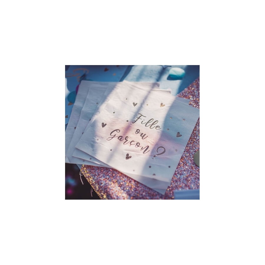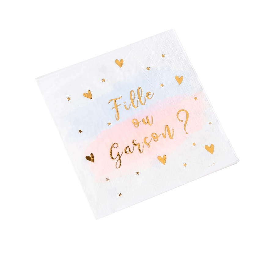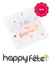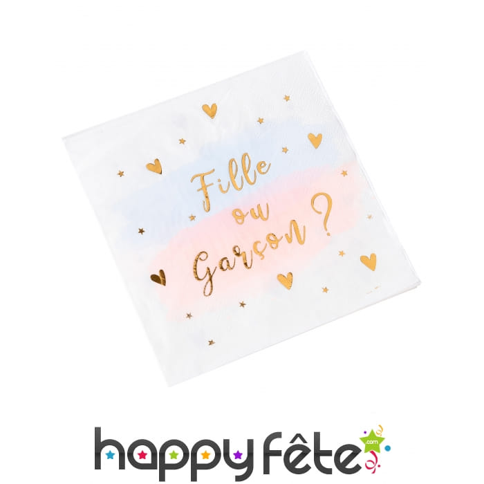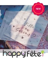 Sur chaque serviettes ont peut lire les mots "Fille ou Garçon" en lettres dorées, accompagnées de petits coeurs dorés.