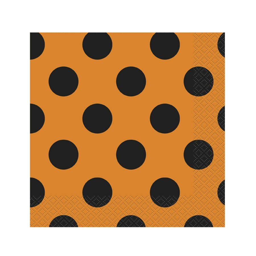 Il s'agit d'un paquet contenant 16 serviettes en papier de couleur orange et présentant des pois noirs sur toute la surface.