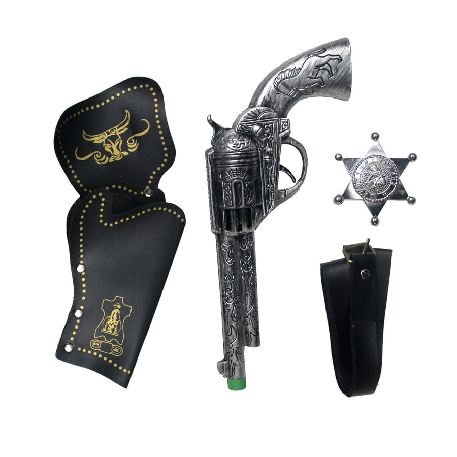 Pour votre déguisement de cowboy ou shérif, à l'occasion d'une fête sur le thème Western, que vous soyez petit ou grand, optez pour ce set accessoires de cowboy destiné à la gent masculine. L'ensemble de quatre pièces est composé d'un pistolet et d'une étoile en plastique gris dotés de détails très réalistes, d'un holster et d'un ceinturon noirs.