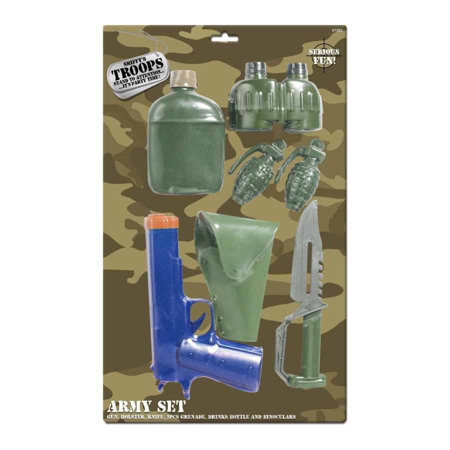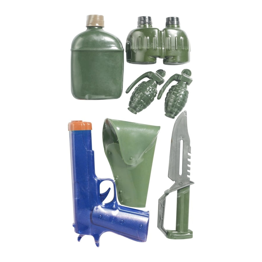 Set d'armée gris et bleu pour homme, adolescent ou garçon, composé d'une paire de jumelles, d'une gourde, de 2 grenades, d'un couteau de combat, d'un pistolet et de son holster. Avec ce kit, vous serez fin prêt à partir en guerre contre l'ennemi!