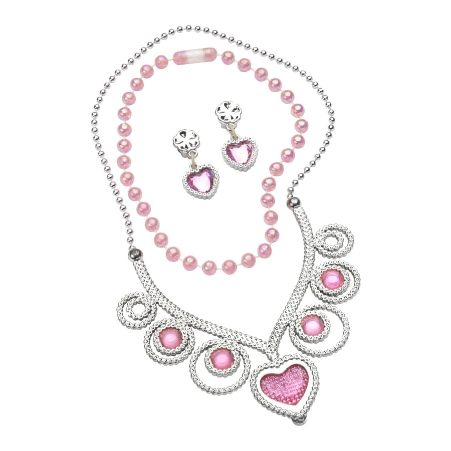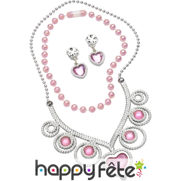 Set de bijoux de princesse, pour fille, composé de deux colliers et d'une paire de boucles d'oreilles. L'un des colliers est en perles roses simples, tandis que l'autre est entièrement en strass argenté avec énorme décoration en forme de coeur et de cercles roses et argentés. Les voules sont argentées avec des coeurs roses. Ce set fera de votre petite fille la plus belle de toutes les princesses!