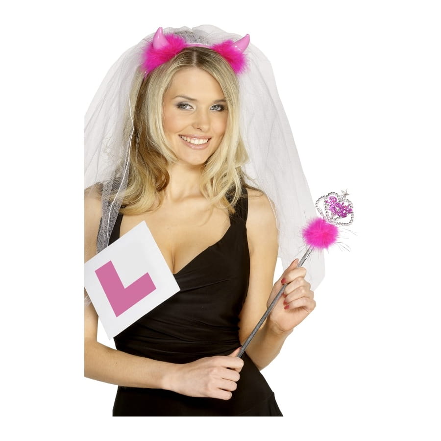Vous allez vous marié a votre enterrement de vie de jeune fille pourquoi ne pas utiliser ce set de bride to be. Ce set d’accessoire est exactement ce que vous avez besoin pour votre enterrement de vie de jeune fille. Ce set est composé d'un voile blanc, d'un plaque blanc avec un L en rosse dessus et d'une baguette avec un pompom et un diadème sur laquelle on à écrit 'Bride to be.'
