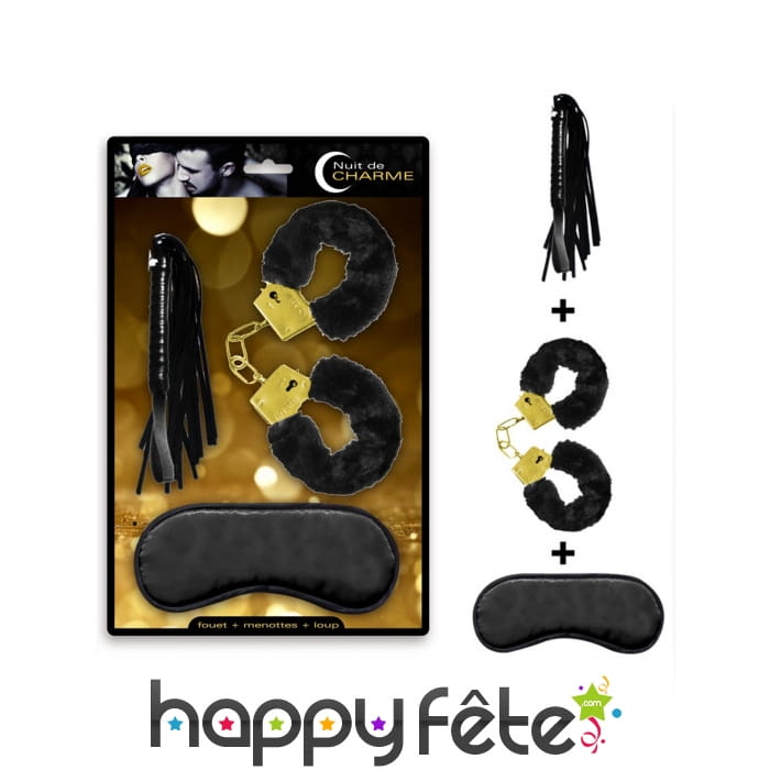 Découvrez de nouvelles sensations palpitantes grâce à ce Set coquin avec menottes fouet et loup pour adulte.