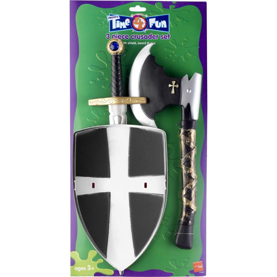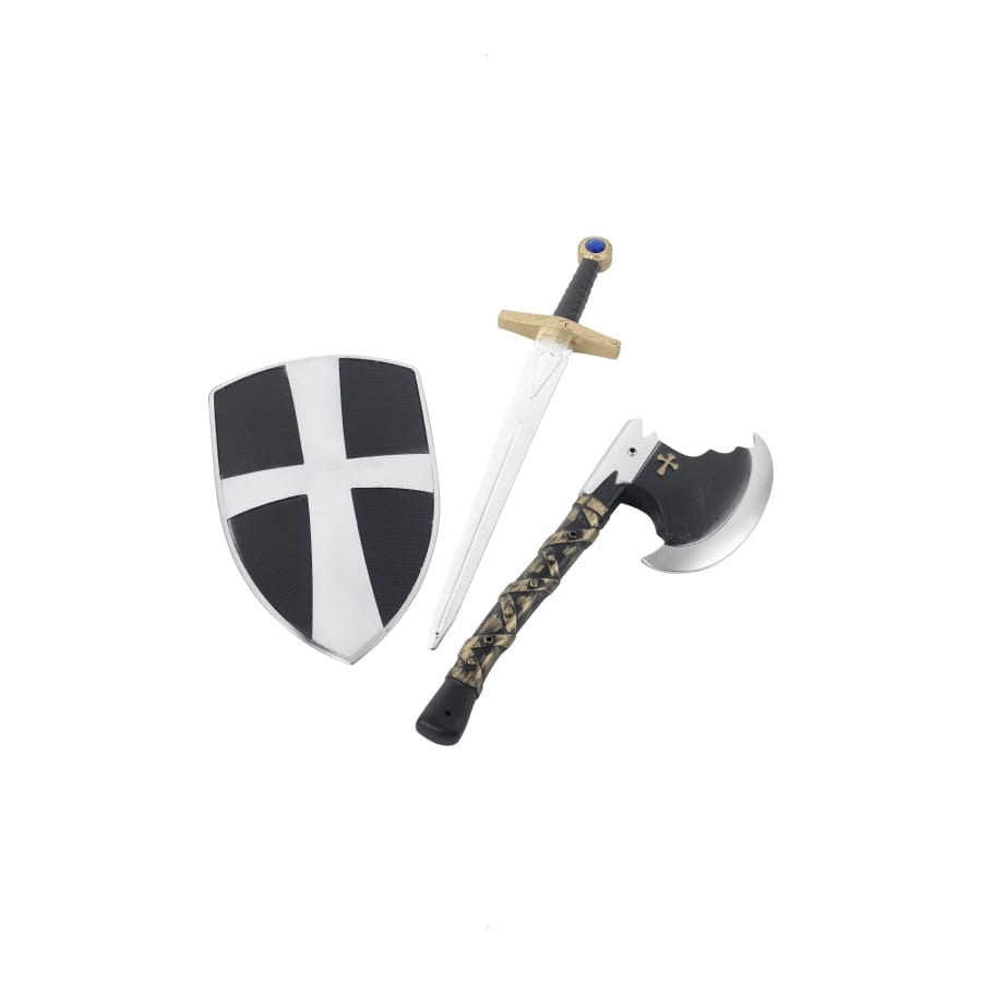 Set de croisé, pour homme ou garçon, composé de 3 pièces dont une épée argentée et dorée, un bouclier noir et blanc et une hache noire et argentée. Déguisez-vous en preux chevalier ou en guerrier médiéval et défendez votre village!