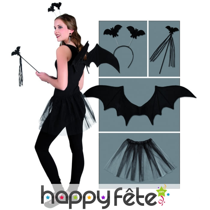 Combinez l'originalité et le look gothique en incarnant un animal nocturne volant pour le carnaval. Le set d'accessoires chauve-souris pour adulte est suggéré pour la gent féminine. Il comporte un attirail complet d'accessoires de couleur noire. Vous disposerez donc d'un léger tutu noir élastique à la taille accompagné d'une paire d'ailes de chauve-souris faisant chacune 48 cm de dimension. Une coiffe est aussi fournie. Elle est formée par un serre-tête noir équipé de deux antennes sur lesquelles vous retrouverez des mini chauves-souris. Et enfin, vous aurez droit à une baguette noire avec une petite chauve-souris installée sur l'une des extrémités.