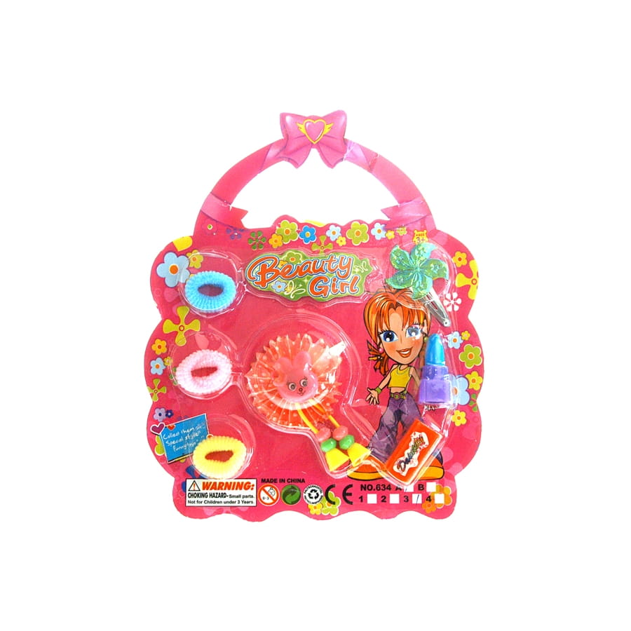 Votre petite fifille a toujours été coquette? Alors, cette carte composée de set d'accessoires de cheveux et de bijoux va grandement lui plaire. La carte est déjà toute jolie en elle-même et quand elle verra ce qu'elle contient, elle va crier de joie. Il y a des bigoudis, des chouchous élastiques pour cheveux, des petits bijoux en tout genre. Et les accessoires ont tous de très belles couleurs vives. La couleur des accessoires peut varier en fonction des lots.