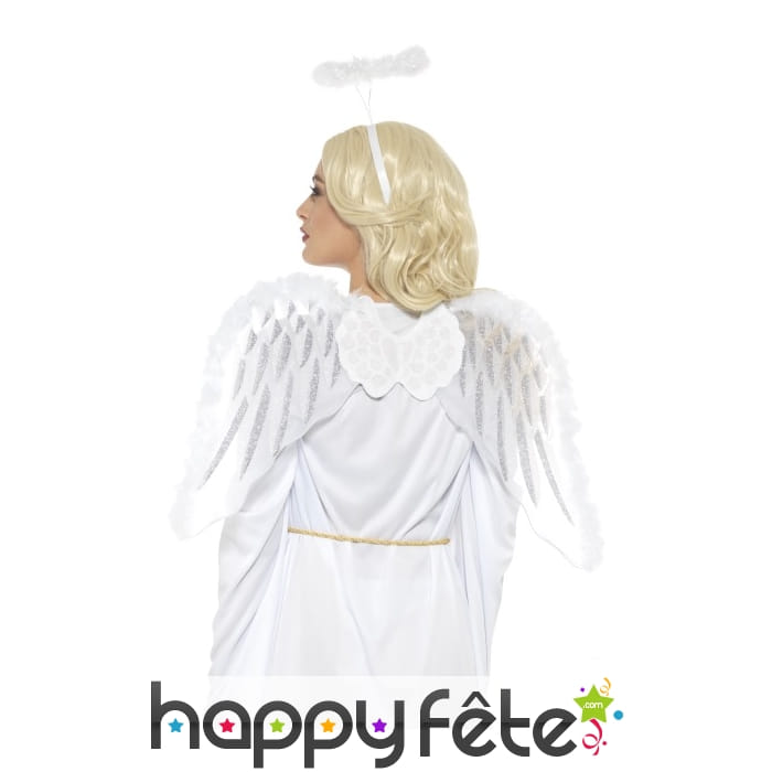 Un ange débarque à l'improviste lors d'un dîner de Noël. Quel accueil vous réservera-t-on dans votre superbe déguisement composé par ce set d'ange blanc, ailes et accessoires ? Cet ensemble comporte une paire d'ailes de couleur blanche, mesurant 70 x 45 cm de dimension. Ces fameuses ailes sont ornées de petits détails scintillants et leur contour est agrémenté d'une fine fourrure blanche. Retrouvez aussi une magnifique auréole pailletée montée sur un serre-tête blanc. L'accessoire sublimera votre coiffure et vous transformera en ange gardien ! L'ensemble se porte idéalement avec une longue robe de couleur blanche. Vous deviendrez alors une ravissante créature céleste lors du prochain carnaval ou à l'occasion d'une crèche vivante à Noël.