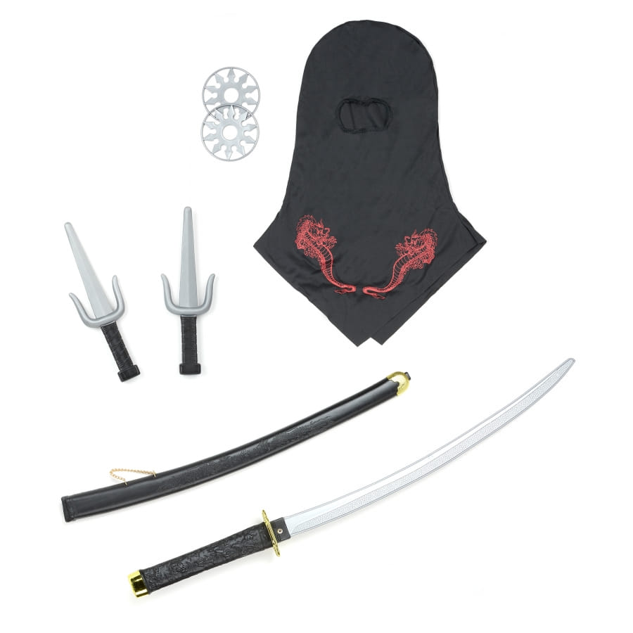 Héritez de l'équipement complet d'un espion ninja. Petits et grands pourront tous profiter de ce set d'armes ninja en plastique. La panoplie comporte des éléments en plastique, à savoir un sabre de couleur noire et argentée, fourni avec son étui ; il est accompagné de deux petits couteaux assortis, ainsi que de deux étoiles argentées. Une cagoule noire avec imprimé dragon rouge complète l'ensemble.