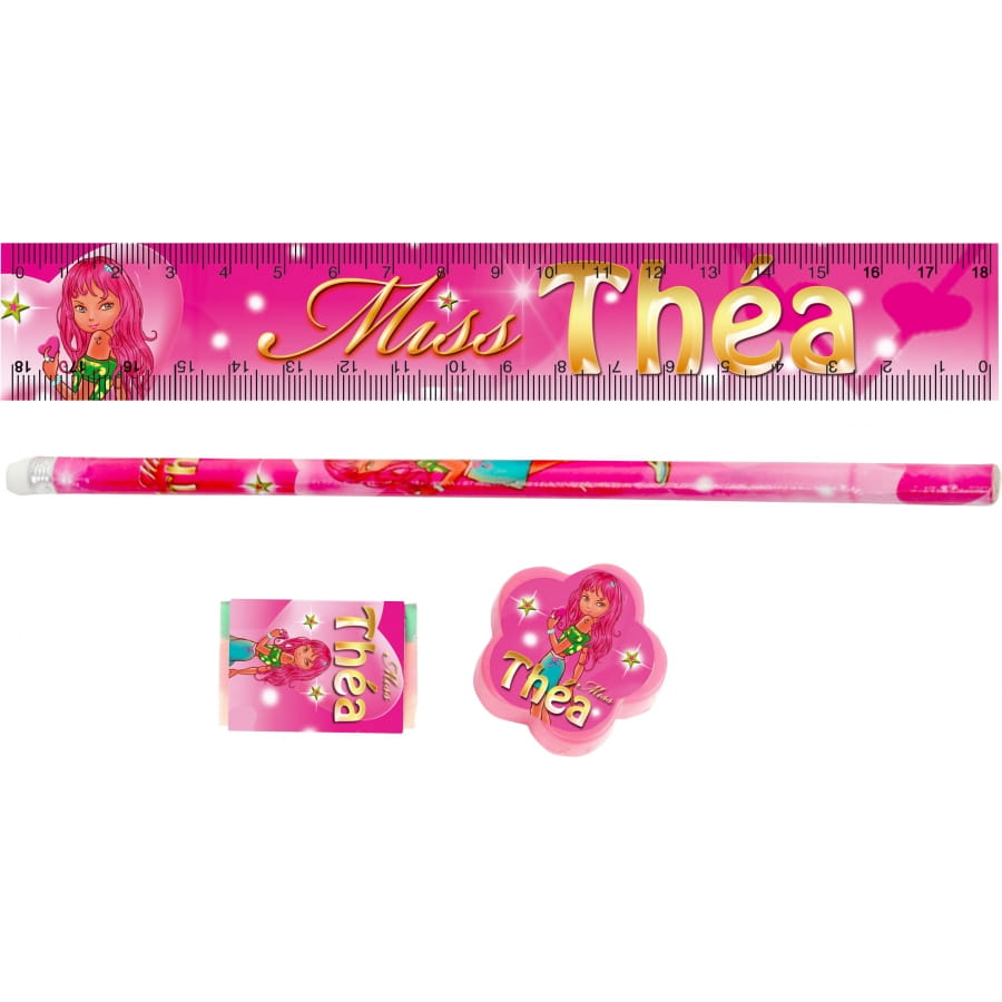 Set de papeterie "Miss Théa" de couleur rose, pour fille. Le set comporte une gomme, un crayon, une latte et un taille-crayon. Chacun des accessoires est imprimé de "Miss Théa" et la règle mesure 19 centimètres. Offrez-le à votre fille pour l'encourager le jour de la rentrée.
