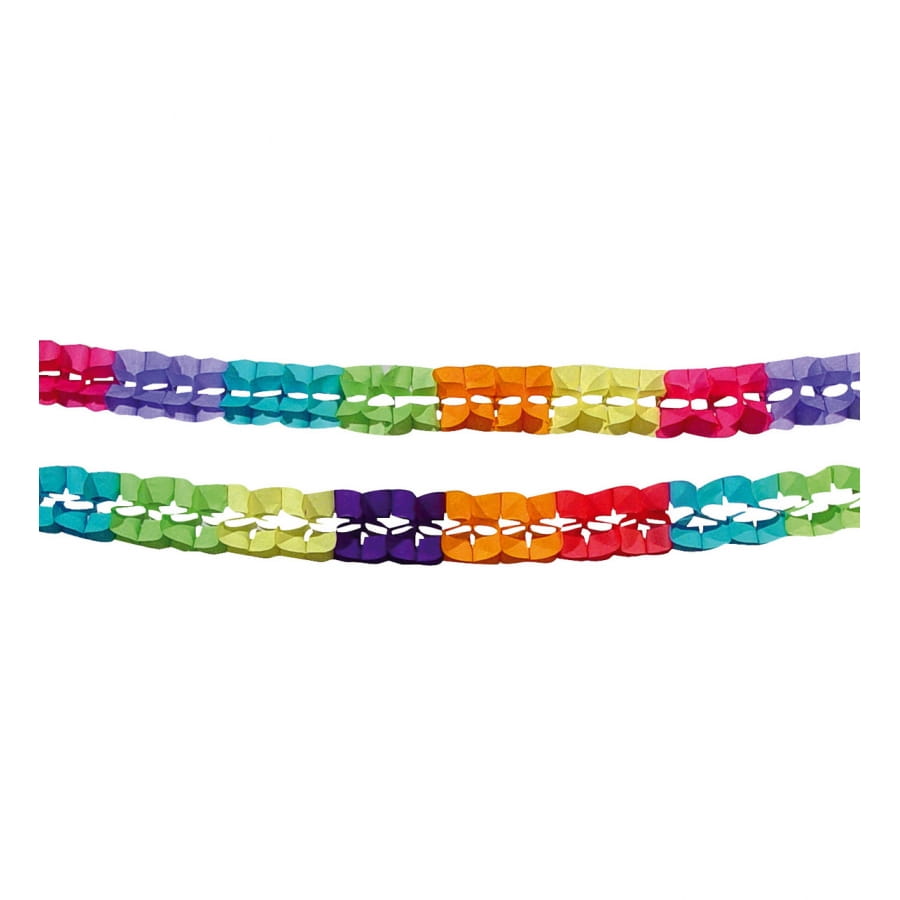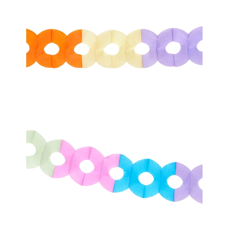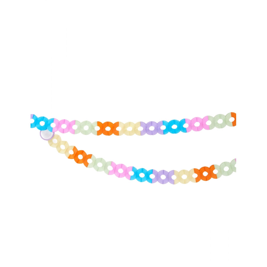 Très simple, très pratique et très sympa, ce lot de 2 guirlandes multicolores va égayer votre décoration d'anniversaire ! Il s'agit d'un set de 2 guirlandes colorées en papier, de 2,5 mètres de long. Une succession de couleurs compose chaque guirlande : bleu, orange, jaune, rose, vert clair et mauve. Elles se déplient et s'accrochent à l'aide d'une petite ficelle incluse dans l'article.
