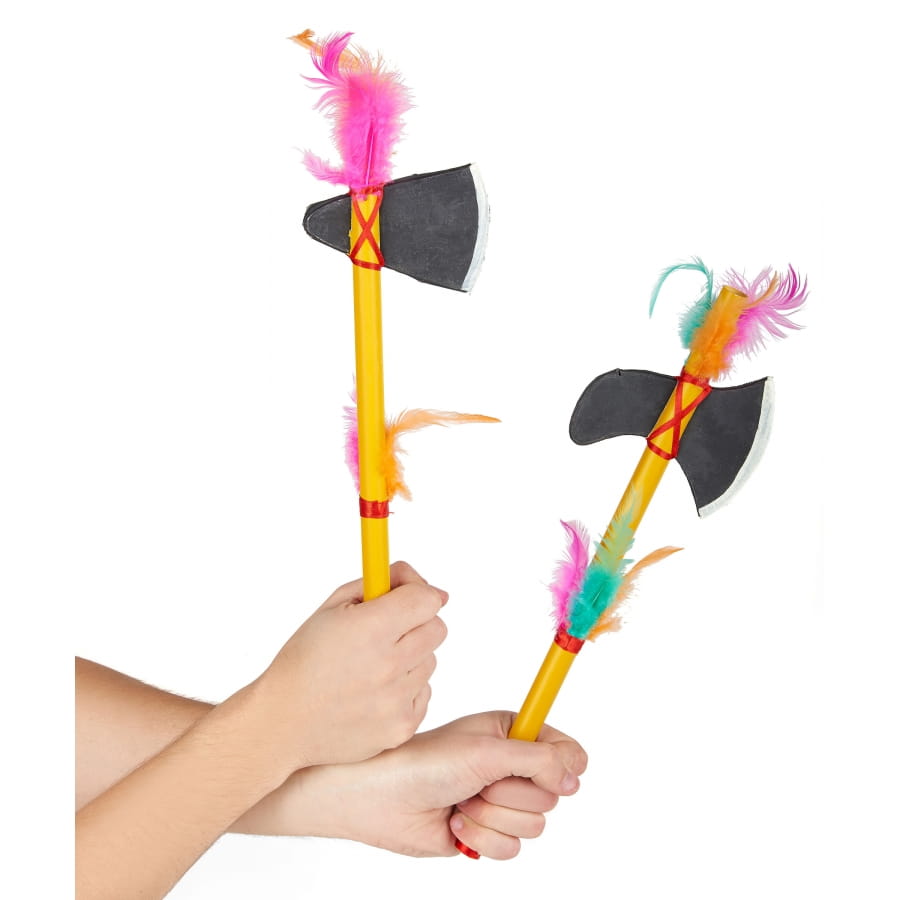 Les indiens attaquent et ils sont bel et bien armés ! Ce set de 2 tomahawks en plastique vous servira d'accessoire pour un carnaval. Il s'agit de 2 haches de couleur jaune, noire, rose et violet. Chacune d'elles est magnifiquement ornée de plumes. Elles conviennent aux petits comme aux grands qui aiment se faufiler dans la peau d'un indien.