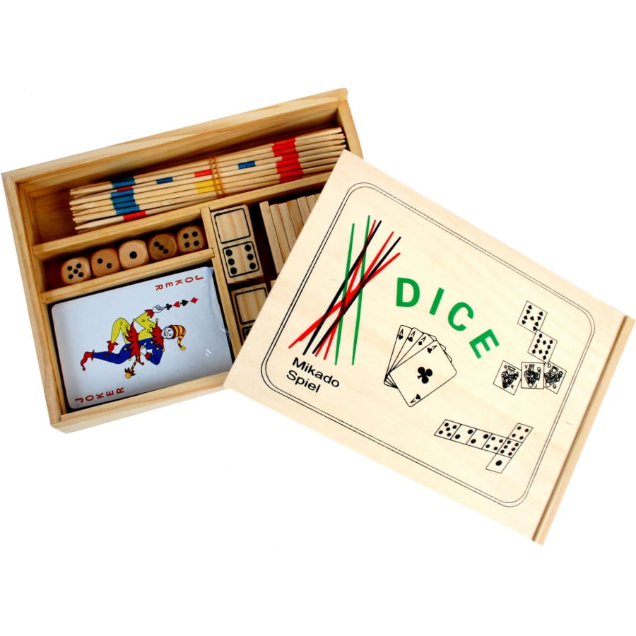 Boîte de jeux en bois 4 en 1. Les jeux inclus sont le domino, le mikado, les cartes et les dés. Il est impossible de choisir les jeux inclus ou la couleur du set. Vous le recevrez comme présenté. Il est idéal pour faire passer le temps.