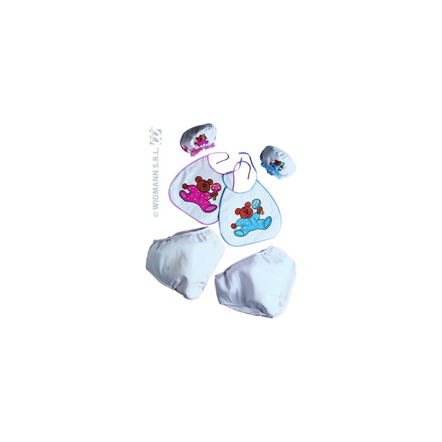 Set de déguisement de carnaval pour homme ou femme composé d'une couche, d'un bonnet et d'un bavoir. Il est impossible de choisir le modèle ou la couleur des accessoires lors de l'achat. Vous les recevrez en bleu, blanc ou rouge avec un petit ourson dessus. Ils sont idéaux pour faire de vous un grand bébé!