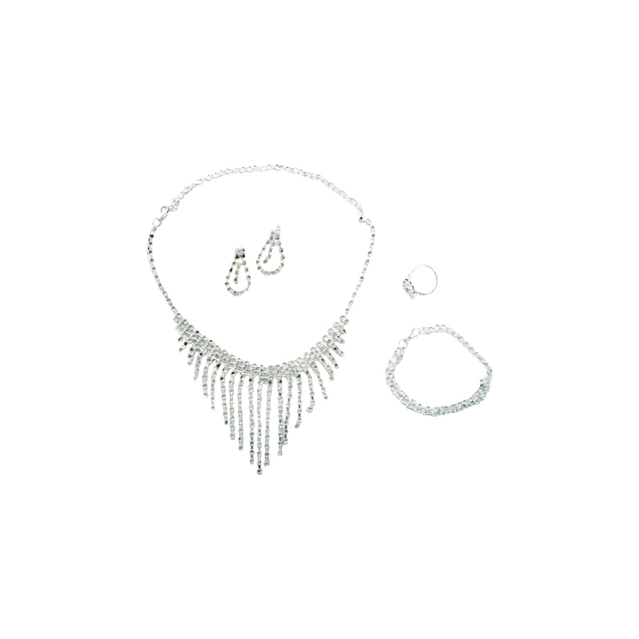 Set de déguisement de charme, pour femme, composé d'une bague, d'un collier, d'un bracelet et d'une paire de boucles d'oreilles en strass argentées. Cet ensemble d'accessoire est idéal pour une soirée Jet Set ou cabaret.