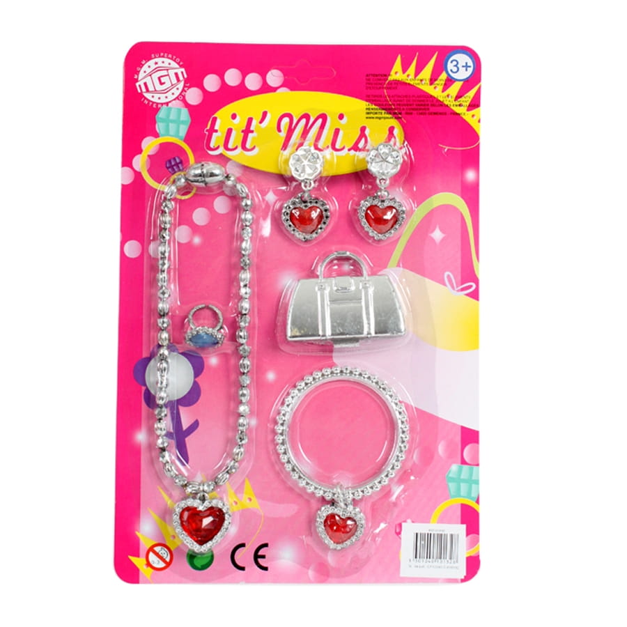 La coquetterie n'a pas de limite. Les petites filles auront affaire à des bijoux de grande dame à travers ce set de bijoux enfant tit miss. Le blister de 17 x 25 cm de dimension contient un collier, un bracelet, et des boucles d'oreilles à clipser. Il s'agit de bijoux fantaisies de couleur argent, au design inspiré des années 70-80.