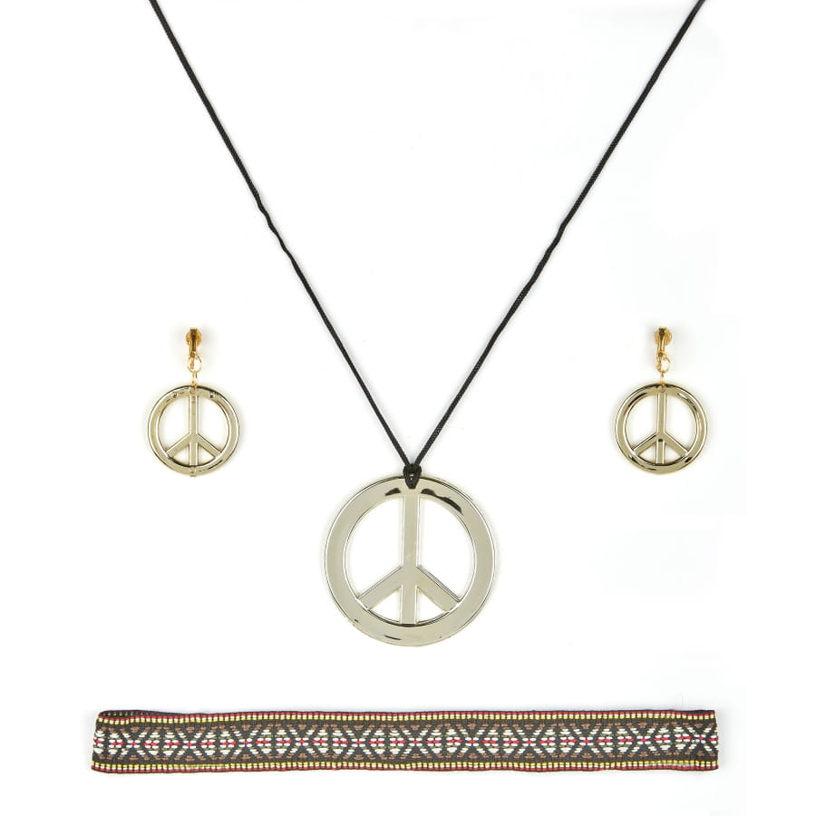 Il se compose d'un bandeau élastique noir décoré par des motifs rouge et blanc, d'une paire de boucles d'oreilles à clips représentant l'emblème de la paix en plastique doré, ainsi que d'un collier assorti avec un pendentif peace and love argenté de 7 cm de diamètre.