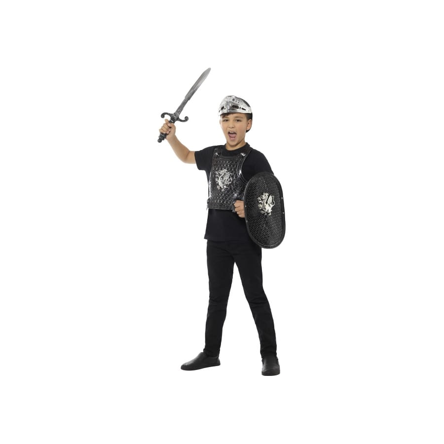 En avant chevalier ! Avant de se lancer sur le champ de bataille, il faut se parer des meilleures armes et des meilleures protections. Votre petit garçon remportera de légendaires victoires avec ce set de chevalier noir pour enfant. Il s'agit d'un ensemble d'accessoires de couleur noire. Votre fils disposera d'une armure à porter au-dessus d'un tee shirt, de préférence noir comme sur la photo, d'un petit casque de chevalier, d'un superbe bouclier rond, ainsi que d'une épée pour combattre les ennemis. Cet article inspiré de l'époque médiévale va ravir les coeurs des petits intrépides en quête d'action et d'aventure. Désormais bien équipé, votre chevalier servant va pouvoir passer à l'attaque !